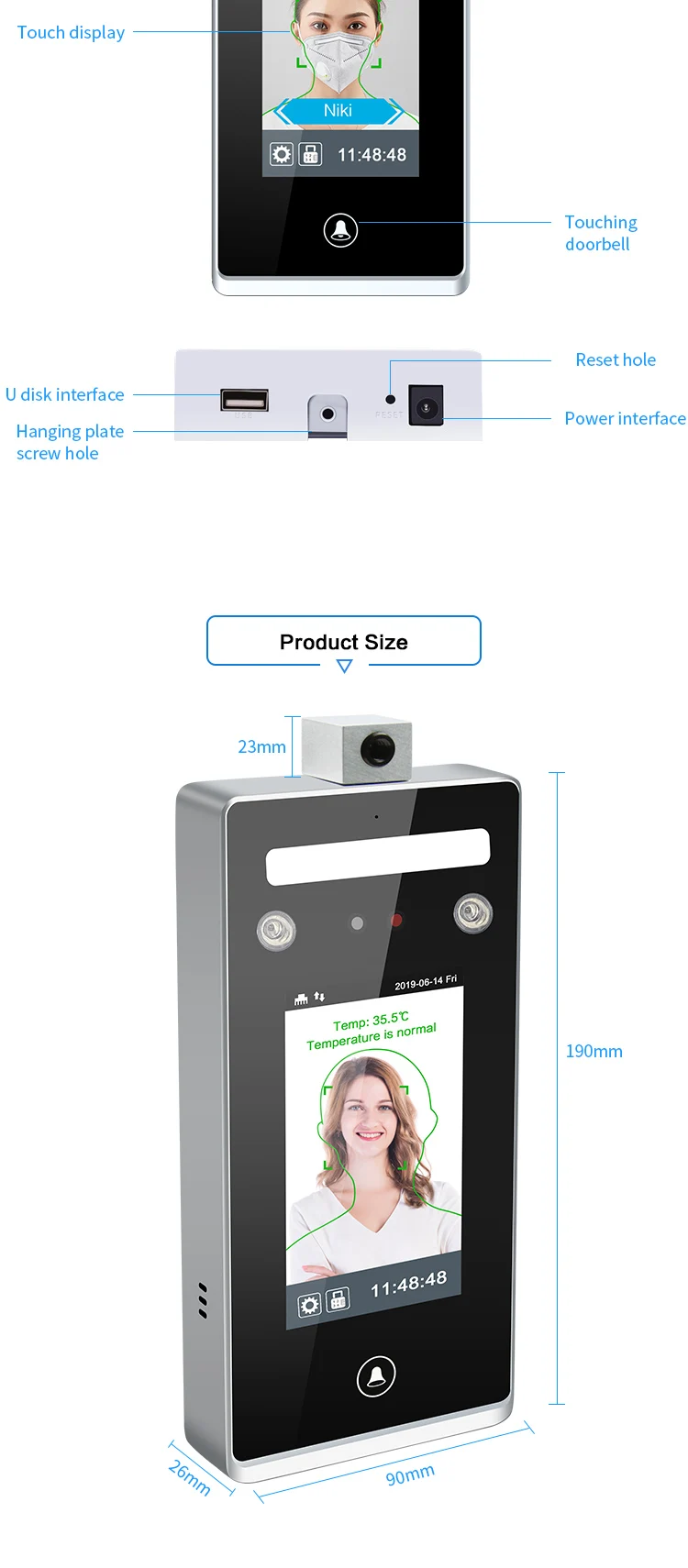 | 1. Non-contact long-range temperature measurement (0.5 meters). Voice reminder for abnormal body temperature, reducing the risk of cross-contact; |