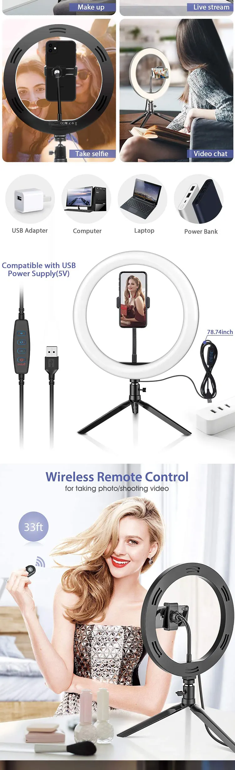 Wireless Remote Control & USB Powered Your iphone android smartphones can take photo and shoot video by wireless remote. Selfie ring light works with most devices that support usb port, like usb charger, laptop, pc, power bank, etc. If any question, please feel free to email us.