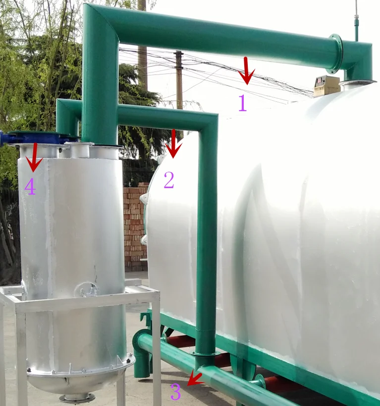 In the carbonization process ,can produce combustible gas,can recycle these gas.These gas delivery to the white tank through No.1 pipeline,then open the valve of the No.2 pipeline, these gas can reach to the bottom of the furnace through the No.2 pipeline.At the No.4 valve, you can be connected to a pipeline at the No.4 valve, so that can use the extra gas,these gas can cooking, burnning boiler etc.So can save some cost, it is enery-saving.