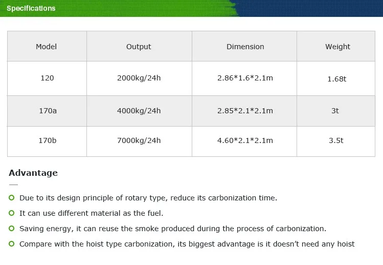 | Name: | carbonization furnace; | carbonization time: | 6-8h; |