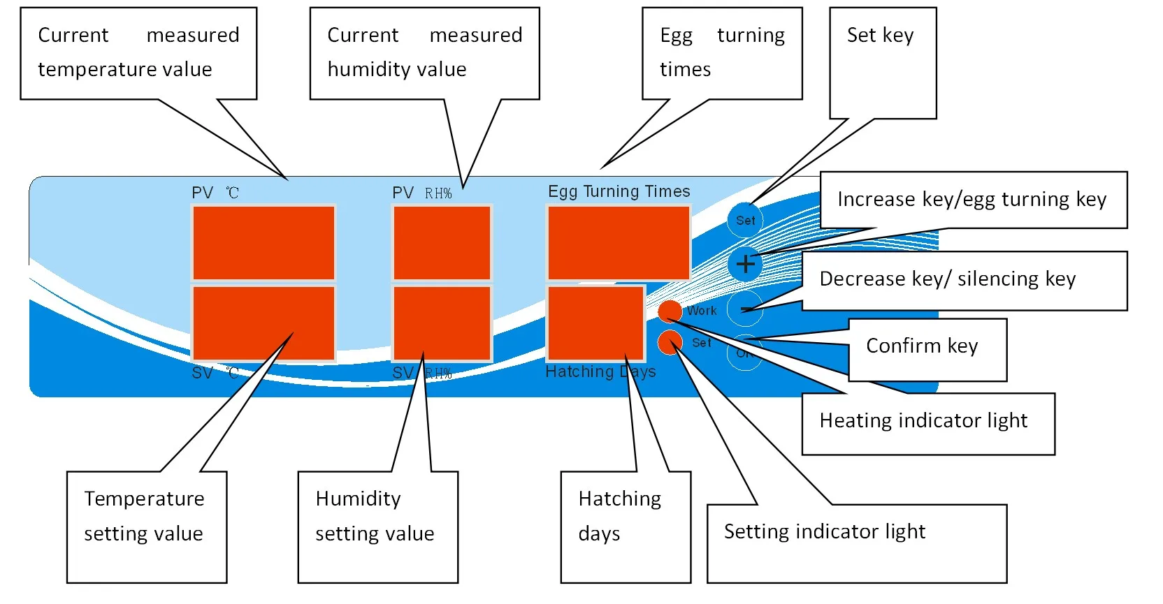 3.LED display temperature/humidity/hatching days/egg turning time.