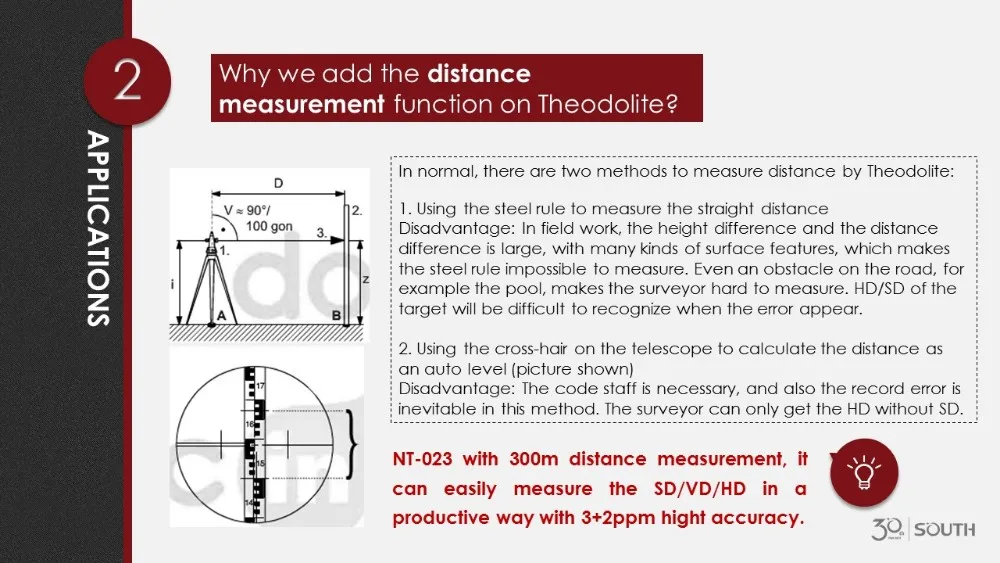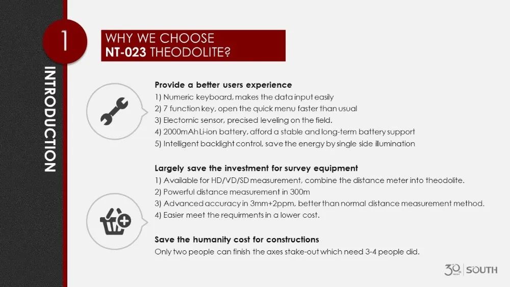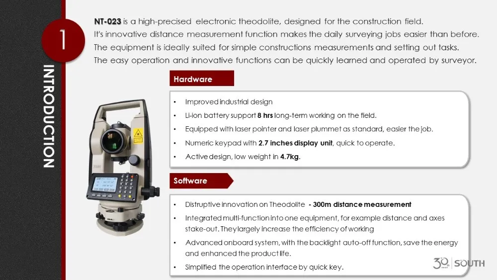 | Distance Measurements: | 300m (single prism); | Power Supply: | 7.4V Lithium battery; |
