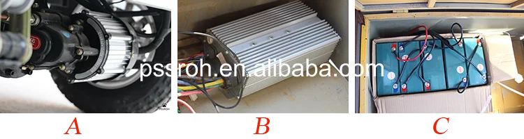 The three elements of the electric vehicle: A: motor, B: controller, C: battery