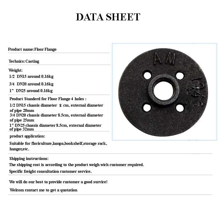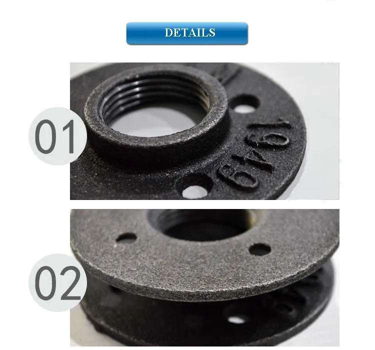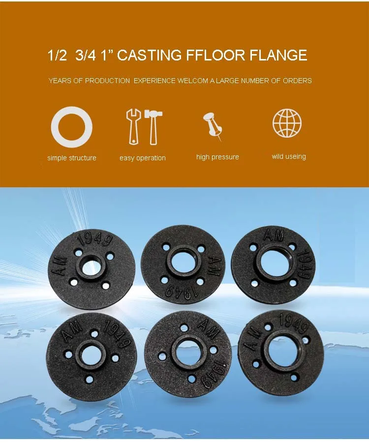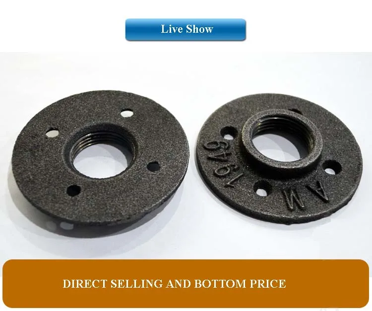 The black malleable iron floor flange is mainly composed of iron, carbon and silicon alloy composition, with high strength, good toughness,.and which used in furniture,for example,table,shelf,clothes rack,hook. the pipe and pipe fittings used in furniture and other field are our main products,we sell it in many countries in the world,for instance EU,USA,JP,CA,ESP and so on.you can ask me and buy it at ease.