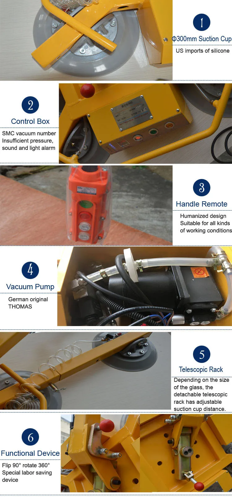 The vertical ground rotates 360° and flips horizontally by 90°. It is used for all kinds of curtain wall and glass suction installation. Easy to operate and easy to carry.