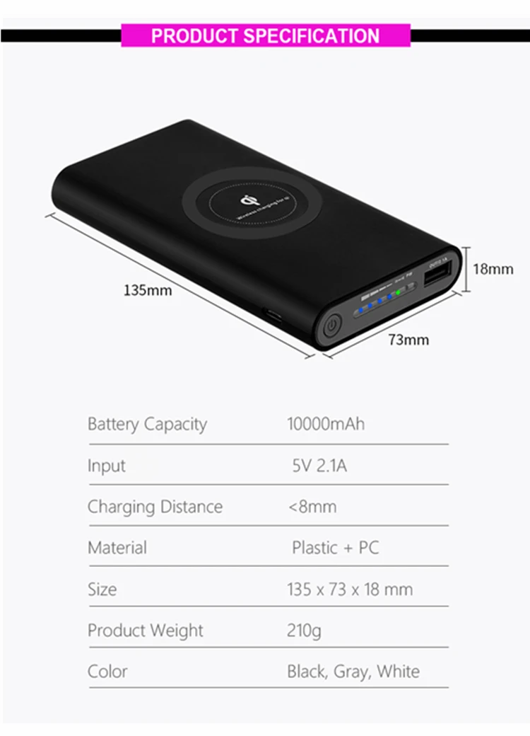 | External Battery Capacity: | 10000mAh; | Charging distance: | 4-8 mm; |