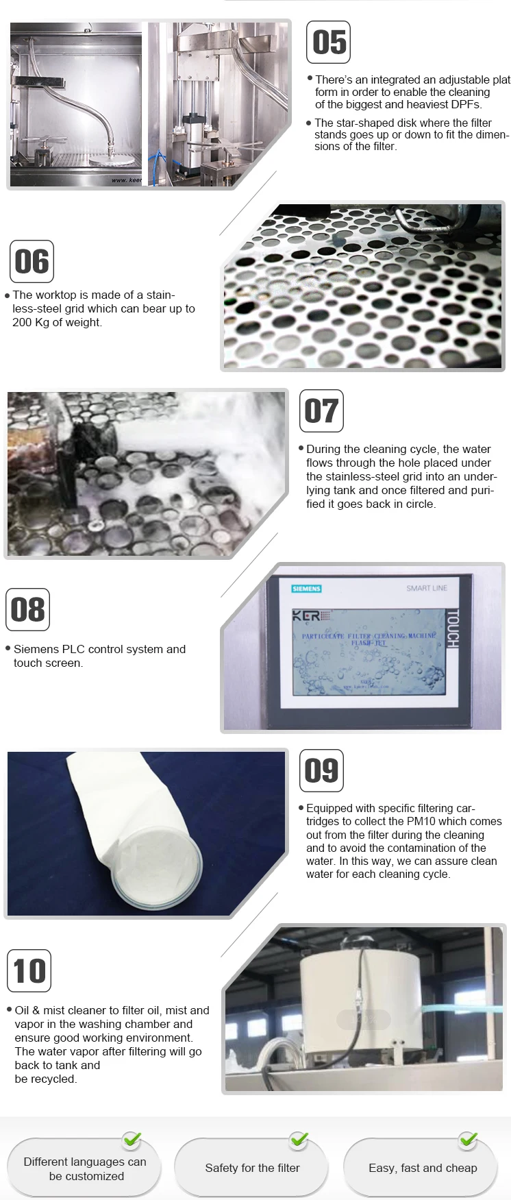 It can be used for different sized DPF, SCR, FAP an air filters of different industrial vehicles (buses, trucks, construction equipment, air conditioners and dust collectors) to completely remove PM10, cerium and oil deposits without damaging the filter.