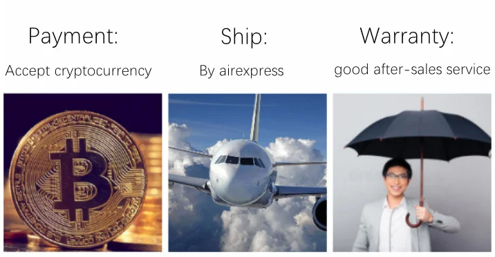 Any product can be paid in cryptocurrency, such as Bitcoin.