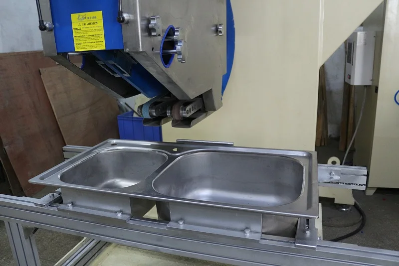 This CNC sink grinding special machine utilizes abrasive belt polishing principle. The abrasive belt is driven by electric motor to conduct polishing on the edge of the welded sink. There are two processes for polishing. Firstly, use the coarse abrasive belt to grind the redundant cutting edge and the projection welding spots. Then use the fine abrasive belt to conduct polishing treatment. After these two processes can meet the requirement of sink grinding and polishing treatment. It is designed to use Mitsubishi professional automatic control system. You only need to input the coordinate data of the product and start the machine, the abrasive belt of the machine will conduct grinding and polishing automatically within the track of preset program. The worker only needs to put and take out the sink.