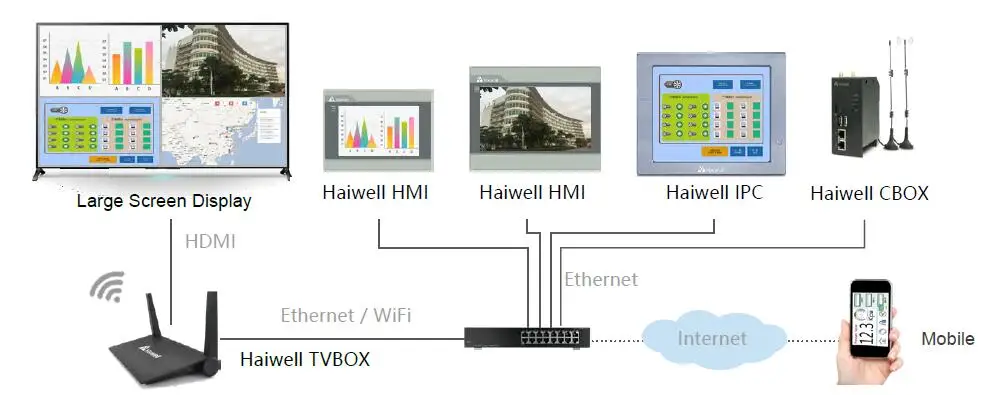 Through TVBOX, the pictures of multiple devices can be combined and shown on a large screen and monitored simultaneously in the form of 4/6/9 squares. Haiwell HMI, cbox, IPC and other equipments support this function.