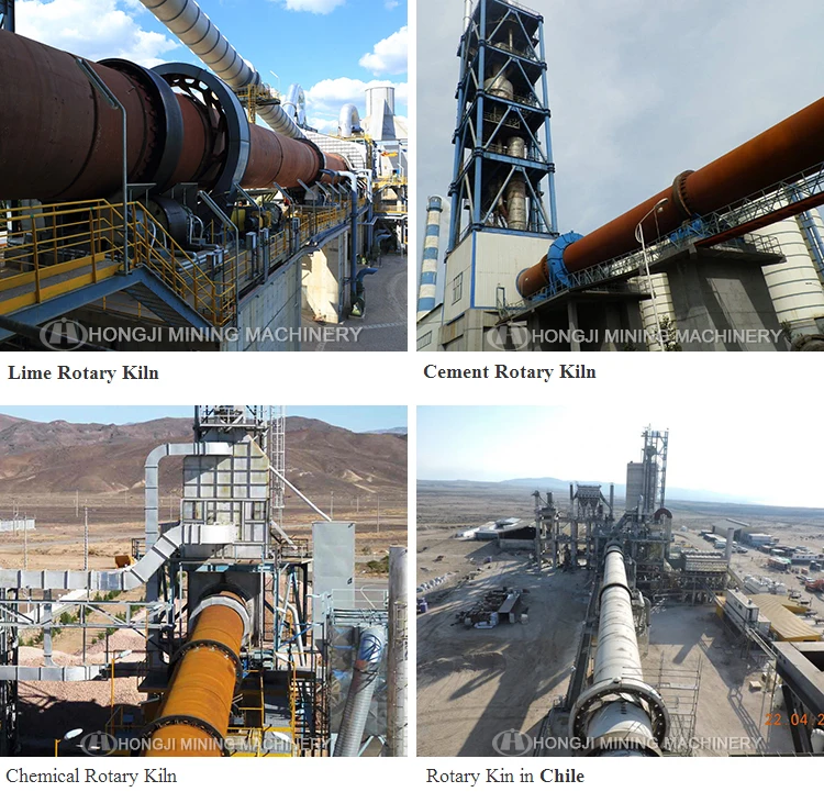The rotary kiln from china professional manufacture Hongji Group Machinery is a cylindrical vessel, inclined slightly to the horizontal, which is rotated slowly around its axis. The material to be processed is fed into the upper end of the cylinder. As the kiln rotates, the materials gradually move down towards the lower end, and may undergo a certain amount of stirring and mixing. Hot gases pass along the kiln sometimes in the same direction as the process material (co-current), but usually in the opposite direction (counter-current). The hot gases may be generated in an external furnace, or may be generated by a flame inside the kiln. Such a flame is projected from a burner-pipe (or 'firing pipe') which acts like a large burner. The fuel may be gas, oil or pulverized coal.