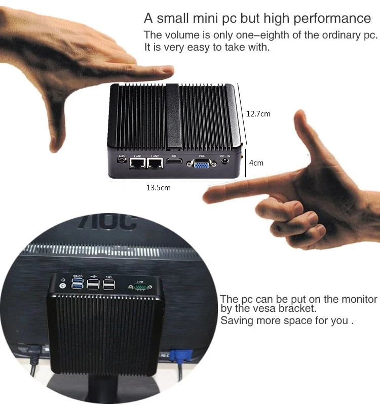 | Single package size: | 15X14X5 cm; | Feature: | fanless mini pc with dual lan dual rs232; |