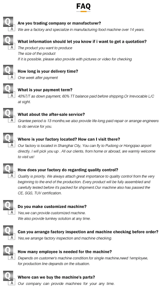 | Package Preview: | ; | Application fields: | Snack food factory,Commercial catering,Meat processing plants,Frozen food Factory,Dairy products factory,Cooking oil factory,Fruit processing plant,flour mill,Beverage Factory,Cannery,Vegetable processing plant,Seasoning plant,BAKERY,WINERY; |