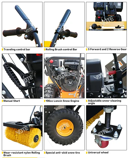 1.Our small snow removal machine(Snow sweeper or sonw blower) adopts Germeny technology, 100% inspection famous brand engine, that ensure it powerful and great suction. Its max throwing distance is from 10m up to 15m. Forward and reverse flexible, make sure the operator easy to work. And there is an adujustable chute, ratary angle up to 190°.