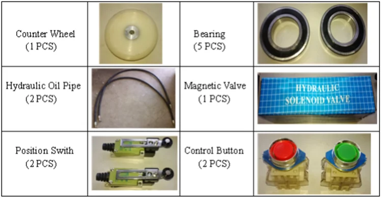 chain 2pcs, hydraulic oil pipes 2 pcs,electro magnetism valves 1 pc,limit switch 2pieces ,counter 1 pc,relay 2 pcs ,switch 1 group.