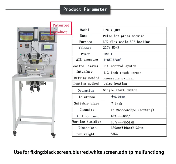GZC-YPJ09 Pulse hot press machine mainly use on soldering mobile phone LCD screen FFC and touch screen FFC, solder FFC to FPC or FFC to PCB, ACF to PCB, USB/HDMI connector to PCB, HSC to LCD screen, FFC/PIN to PCB etc. The working principle is to achieve instant heating when supply the pulse voltage on the Press Head, so that the FFC can be soldered properly when with perfect temperature, timing & pressure.