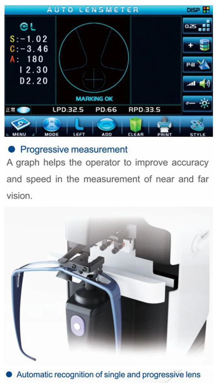 Built-in UV tester, PD measuring, Automatic progressive measuring