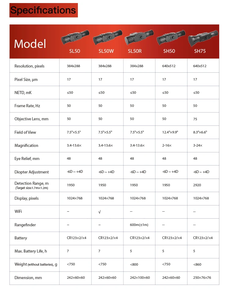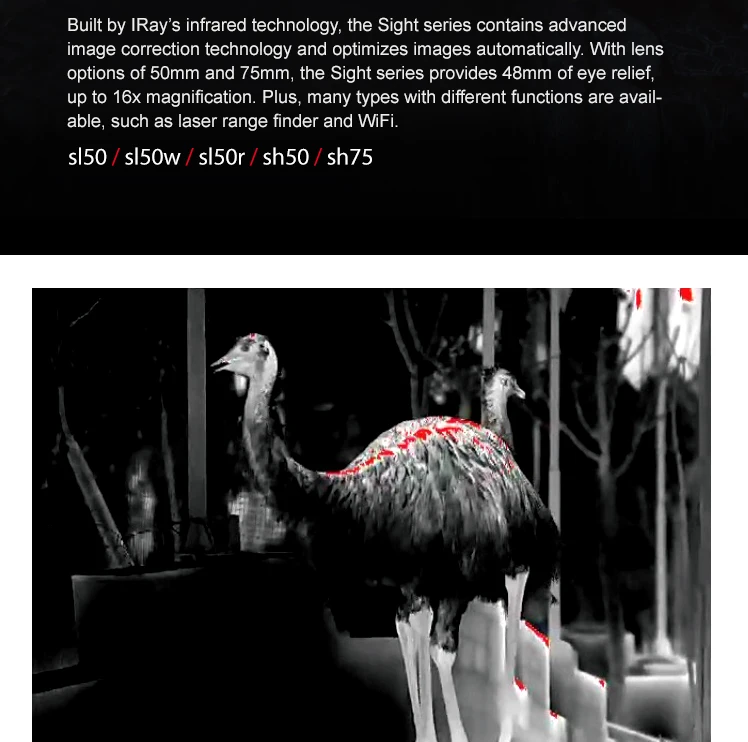 Built by IRay’s infrared technology, the Sight contains advanced image correction technology and optimizes images automatically. With lens options of 50mm and 75mm, the Sight series provides 48mm of eye relief, up to 16x magnification. Plus, many types with different functions are available, such as laser range finder and WIFI.