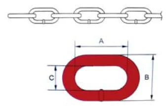 Size | Inside Length (A) | Inside Width (C) | Outside Width (B) | Length per 11 Links | Weight per 100M | Breaking Load | Test Load | |||
