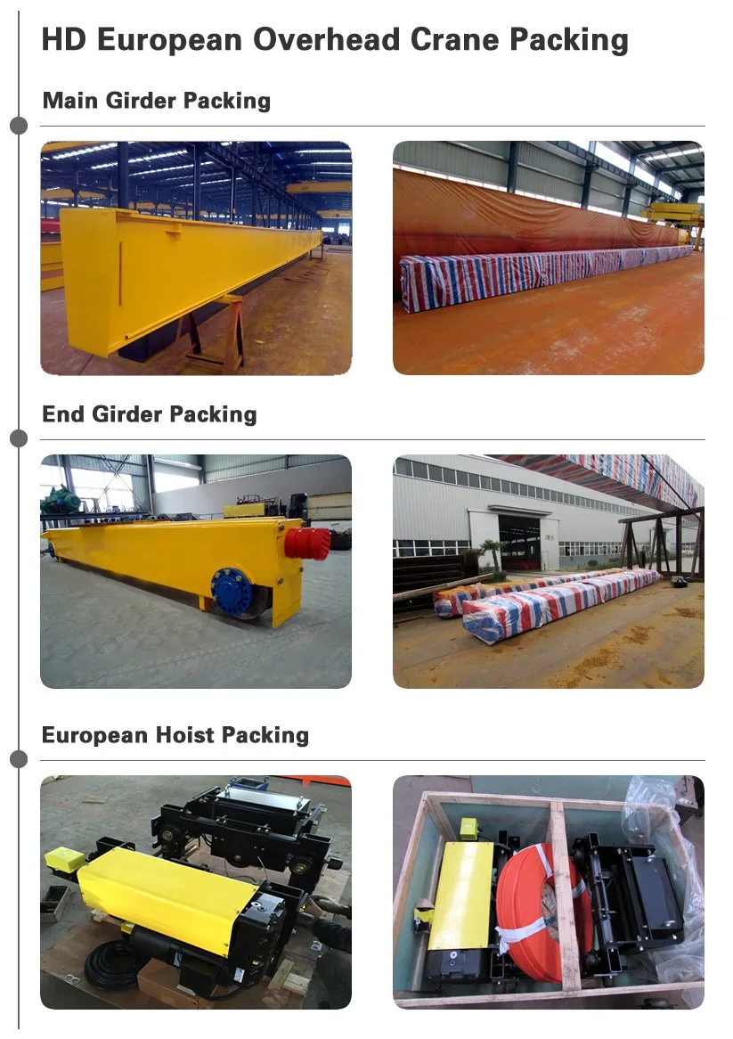 Electric parts and electric hoist are packed by strong plywood crate, crane steel structures packaged in plastic woven cloth.