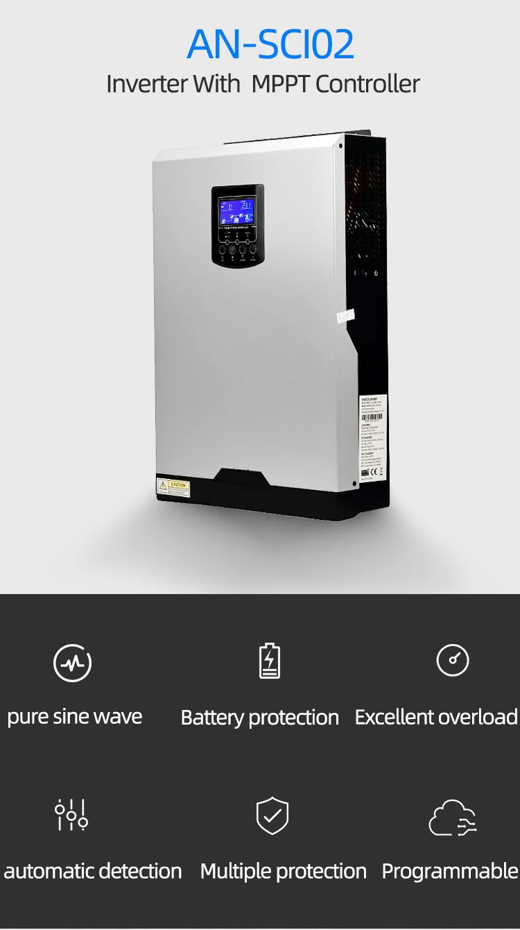 The AN-SCI02 series all in one solar system is the perfect go-to solution for off-grid, backup power for homes, small business, and it also delivers a value added. Inverter running without batteries also can help to reduce cost in solar power system.