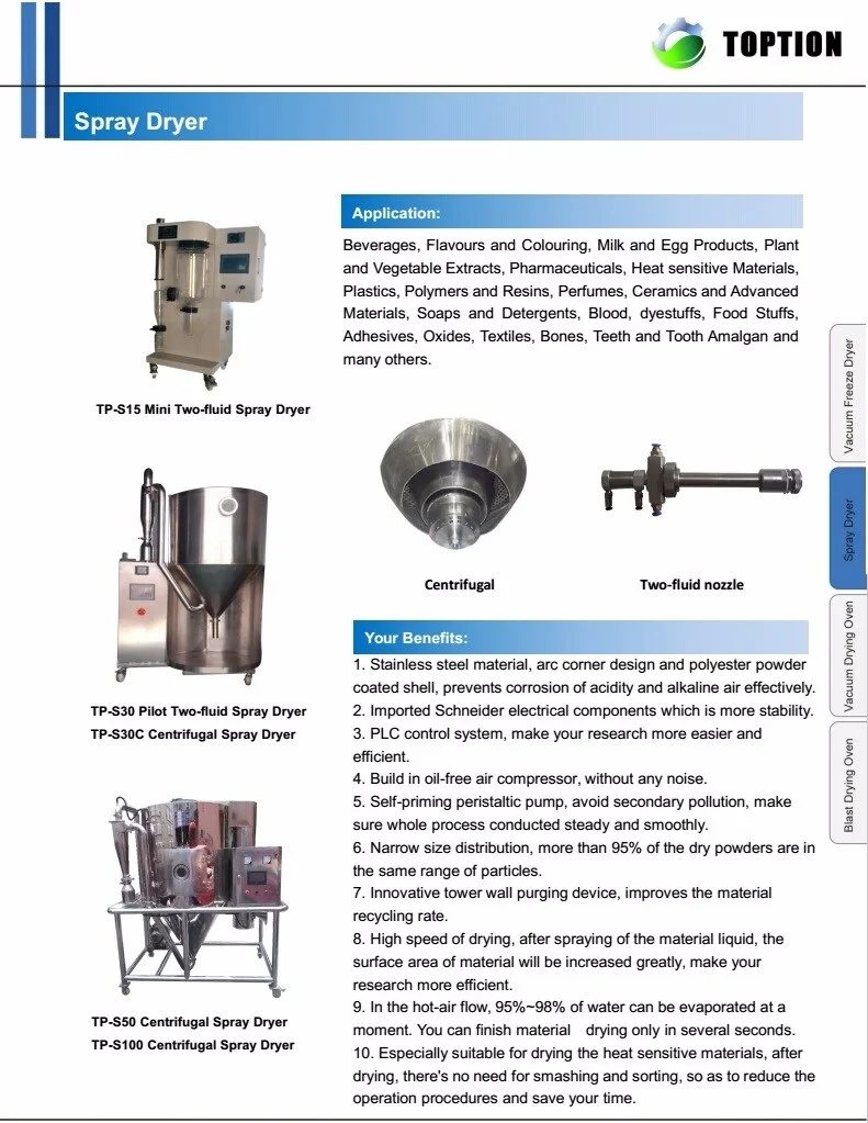 TOPTION Laboratory Spray Dryer assembles many of new design, for example, small size for free moving, combining air compressor and electrical heater inside the cabinet, glass spray and cyclone separator for inspecting. All the data and functions are controlled by PLC.