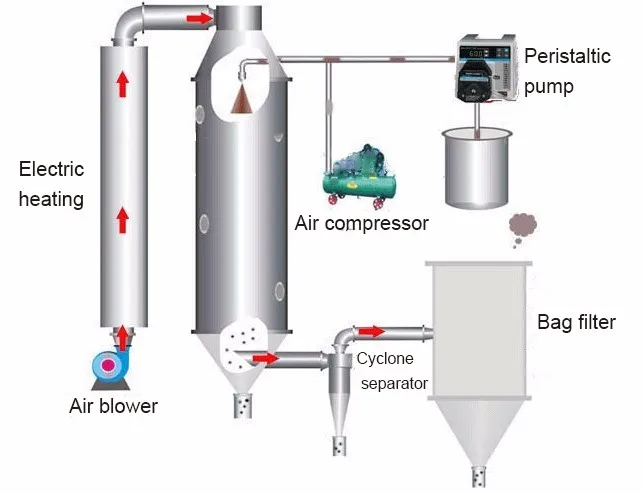 It is popular in fields of Food, biology, material, pharmacy, university, and R&D institute, etc. especially for processing temperature-sensitive material , for e.g., powder, because material only touch air for a brief moment so that heat couldn't destroy the component of material.