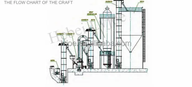 Jaw crusher--Hammer crusher--Lifter--Nateriak silo--Measuring pump--Mill--Selecting powder machine--Lifter--Raw materials silo--Screw feeder--Fluidized bed furnace--Eletrostatic cleaning--Cooling--Lifter-Finisher material silo