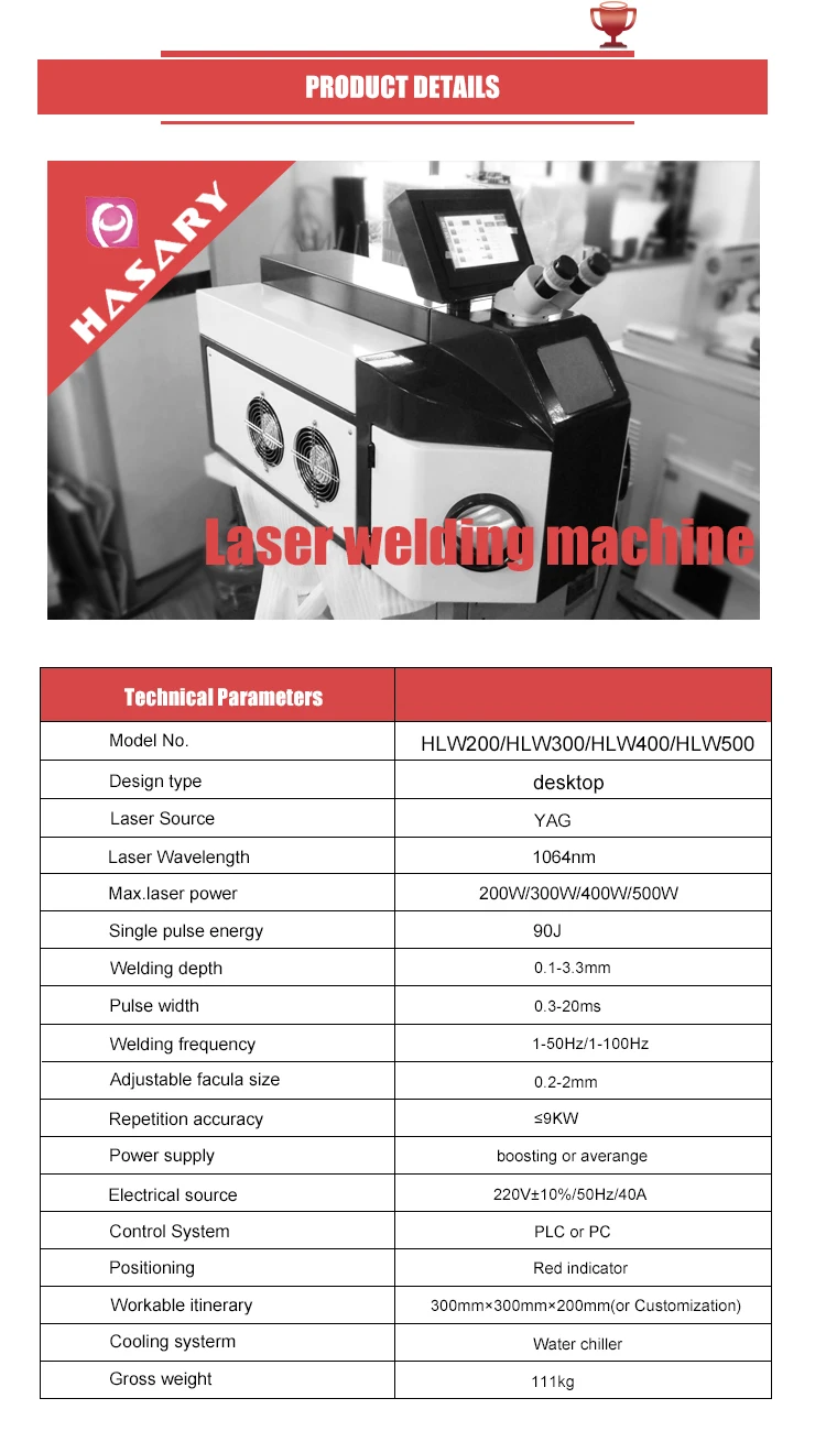 The high energy and high density of laser impulse has small heat affected zone and smooth jointing surface,it can realize exact jointing which can’t do by traditional techniques.Hasary laser welding machine fetch in German technology,so the efficiency is high and easy to handle.
