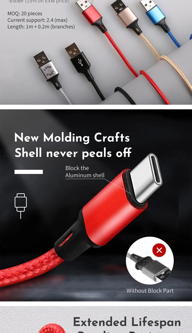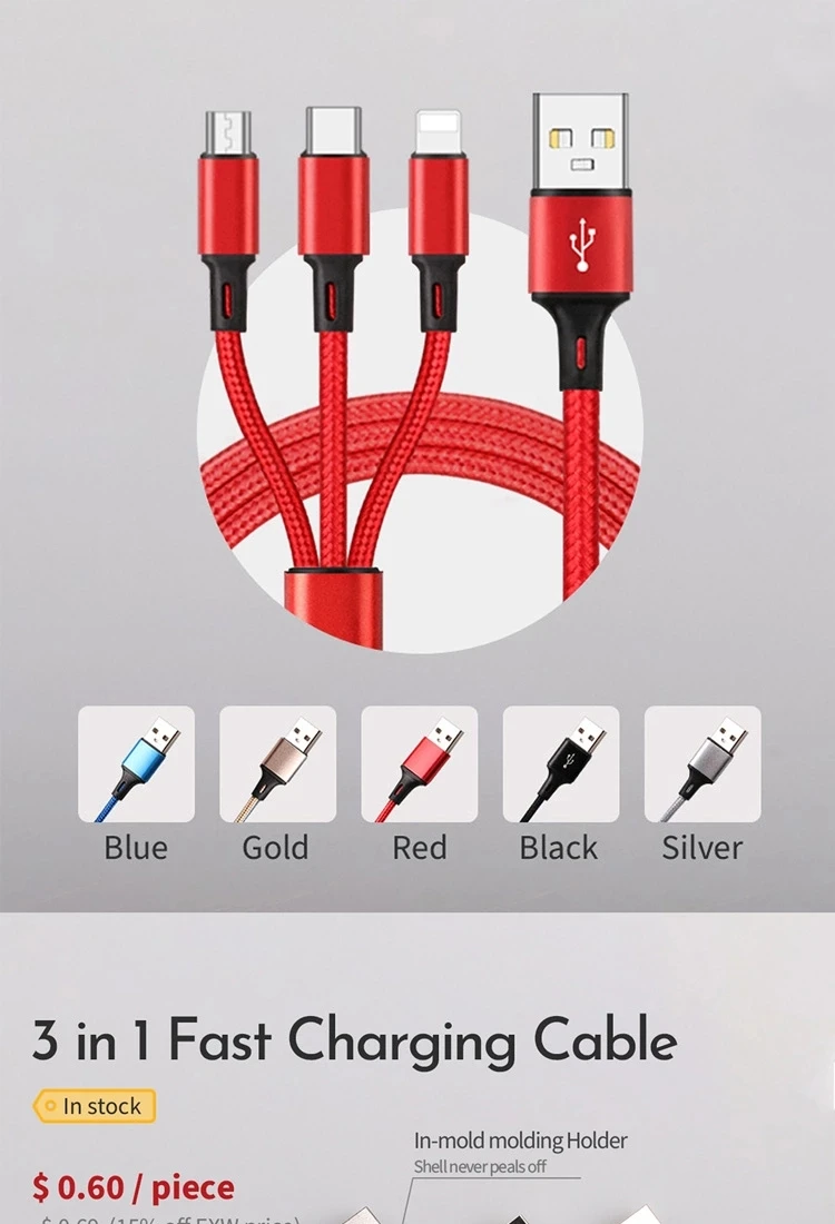 | Connector: | USB 2.0 Connector, Type-C; | Packaging Detail: | 3 in 1 2.4A Fast Charging Nylon Braided Cable iPhone Android charger cable; |