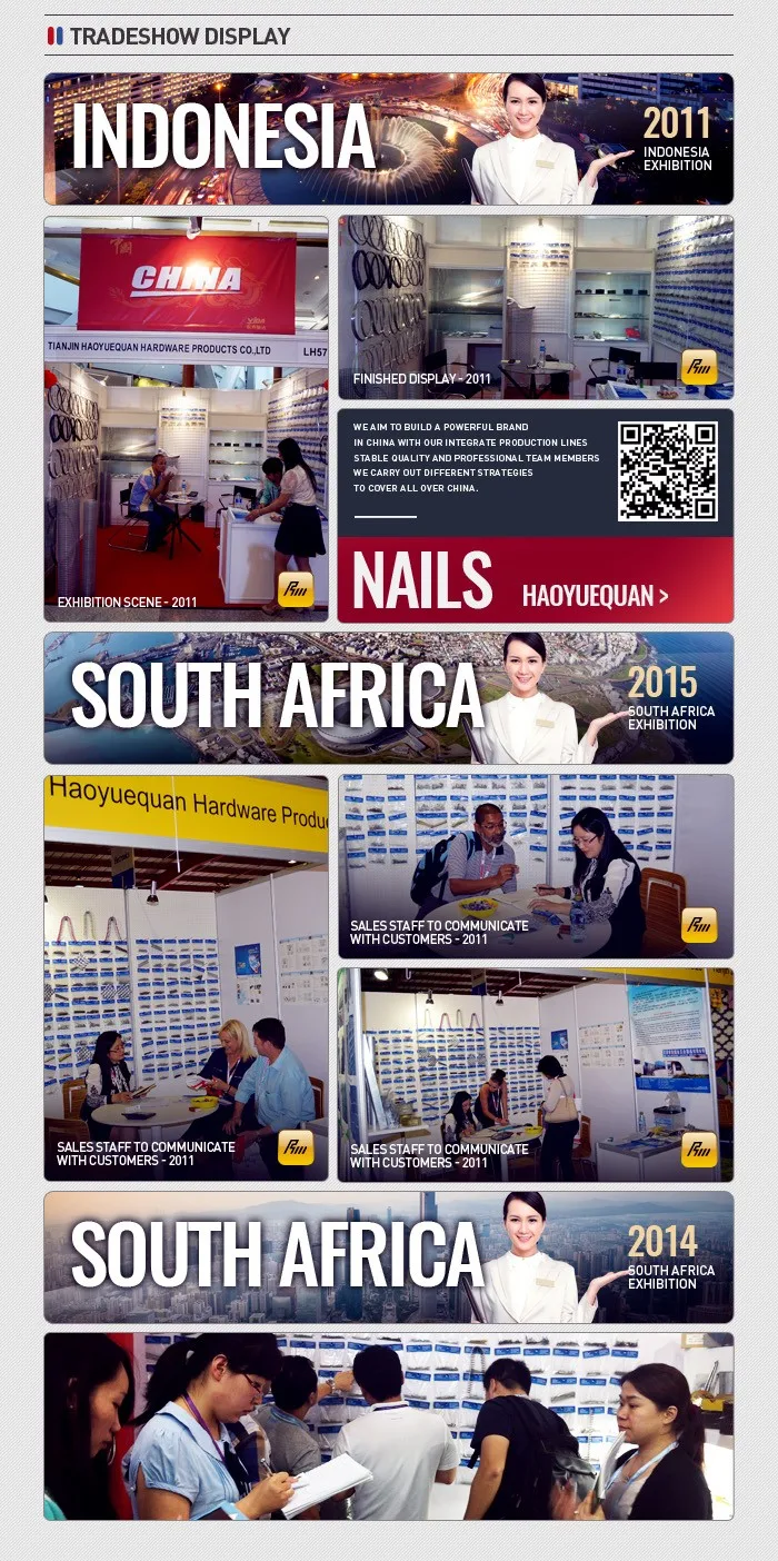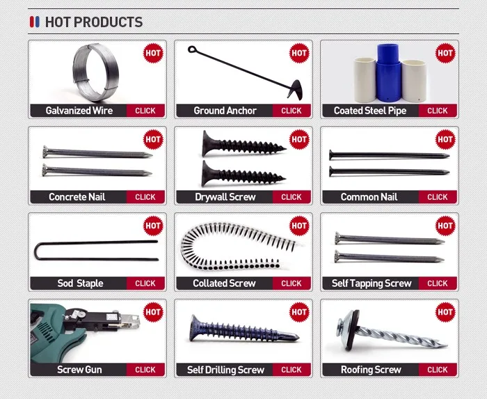Products mainly include:Common nails, roofing nails , concrete nails,drywall screws,twist wire nails, headless nails, double cap nails, felt nails, felt Vol nails, , chipboard screws, self-tapping screws, drilling screws, and all kinds of metal wire and so on. Products are widely used in automotive, construction and fitting, bicycle parts, wooden furniture, electrical parts, household supplies.