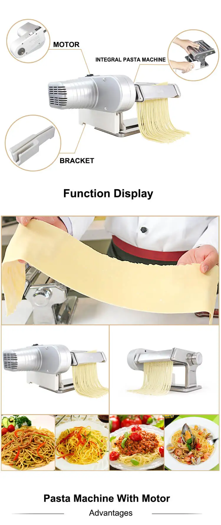 Consist of a manual detachable pasta machine, a bracket and a motor, this product can be used both manually and electrically. With the simple pressing of a finger you can obtain Lasagne,Tagliatelle,Spaghetti and Taglierini.