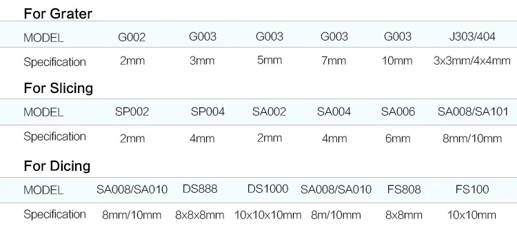 High speed continuous feed precision slicing, grating, chipping, dicing&julienne.