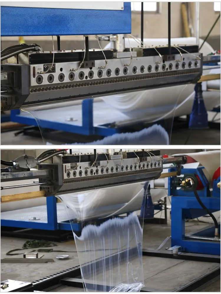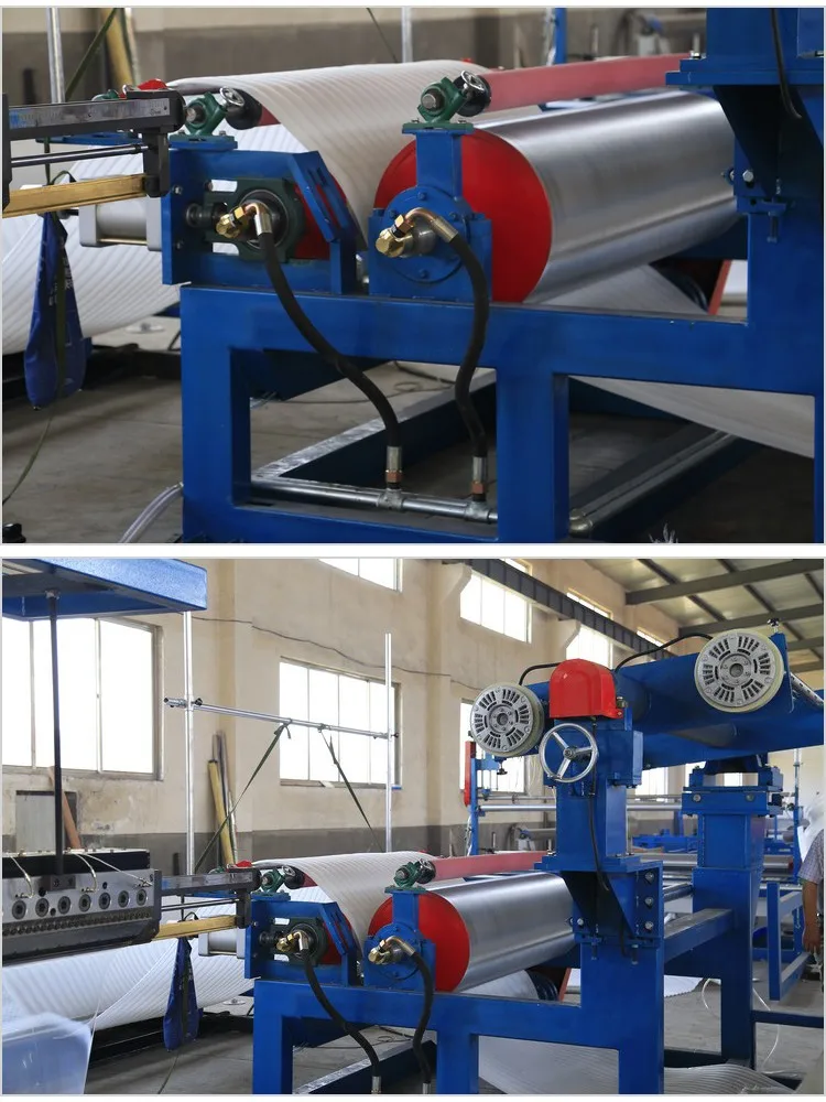 After melting plastic granule material, the extruder produce a layer of PE film as medium of processing objects. Then rollers laminate and emboss them to make uniform pattern on surface. Finally the laminating machines produce out new materials with high sense of concavo-convex without bubble, while moistureproof, heat insulation and heat preservation.