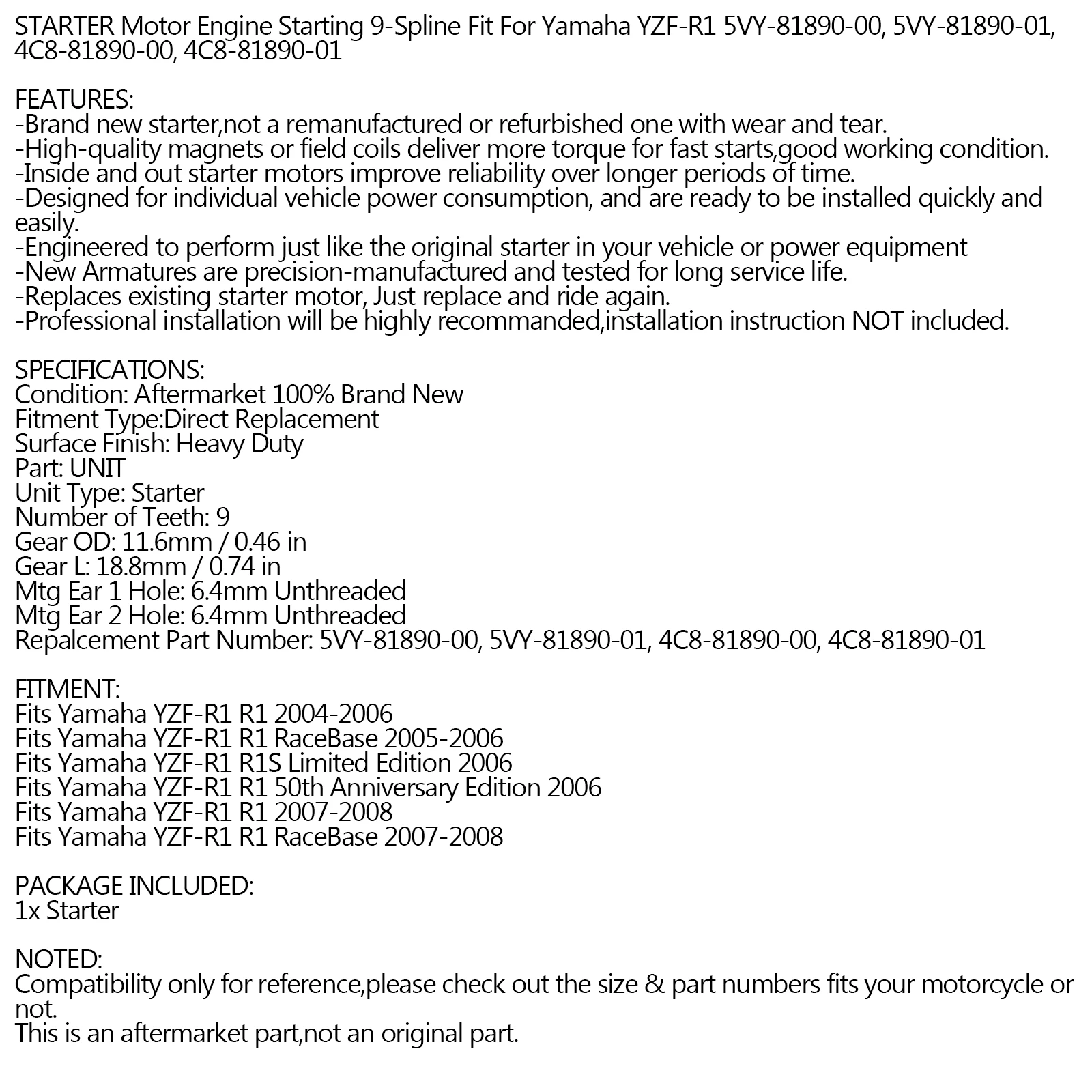 STARTER Motor Engine Starting 9-Spline Fit For Yamaha YZF-R1 5VY-81890-00, 5VY-81890-01, 4C8-81890-00, 4C8-81890-01