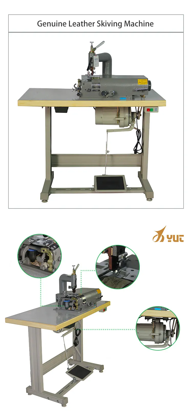 Suitable for skiving edges and skiving thinner surfaces of shoes. The leather skiving machine with circular knife is suitable for edge-skiving and whole surface skiving of many kinds of leather as well as plastic cloth, synthetic leather, felted wool and rubber for shoes, caps, bags, garments, belts, glover and sports goods etc.