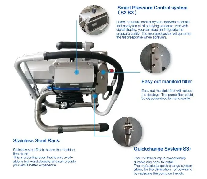 S3 electric airless sprayer with piston pump is specifically designed for the professional painter. It's the ideal choice for contractors who need a higher output, higher-quality sprayer for daily use onresidential jobs.