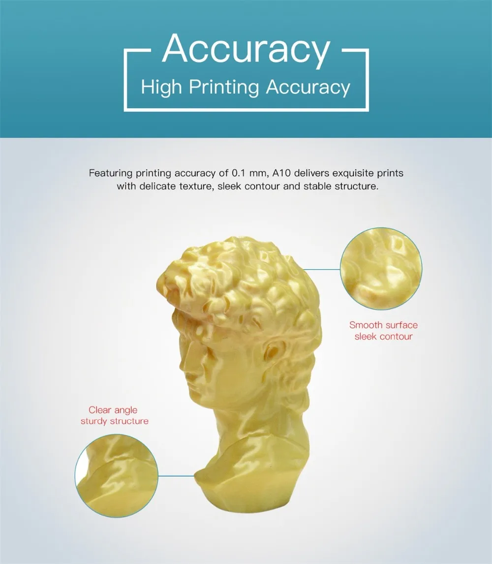 3. Featuring printing accuracy of 0.1 mm, A10 delivers exquisite prints with delicate texture, sleek contour and stable structure.