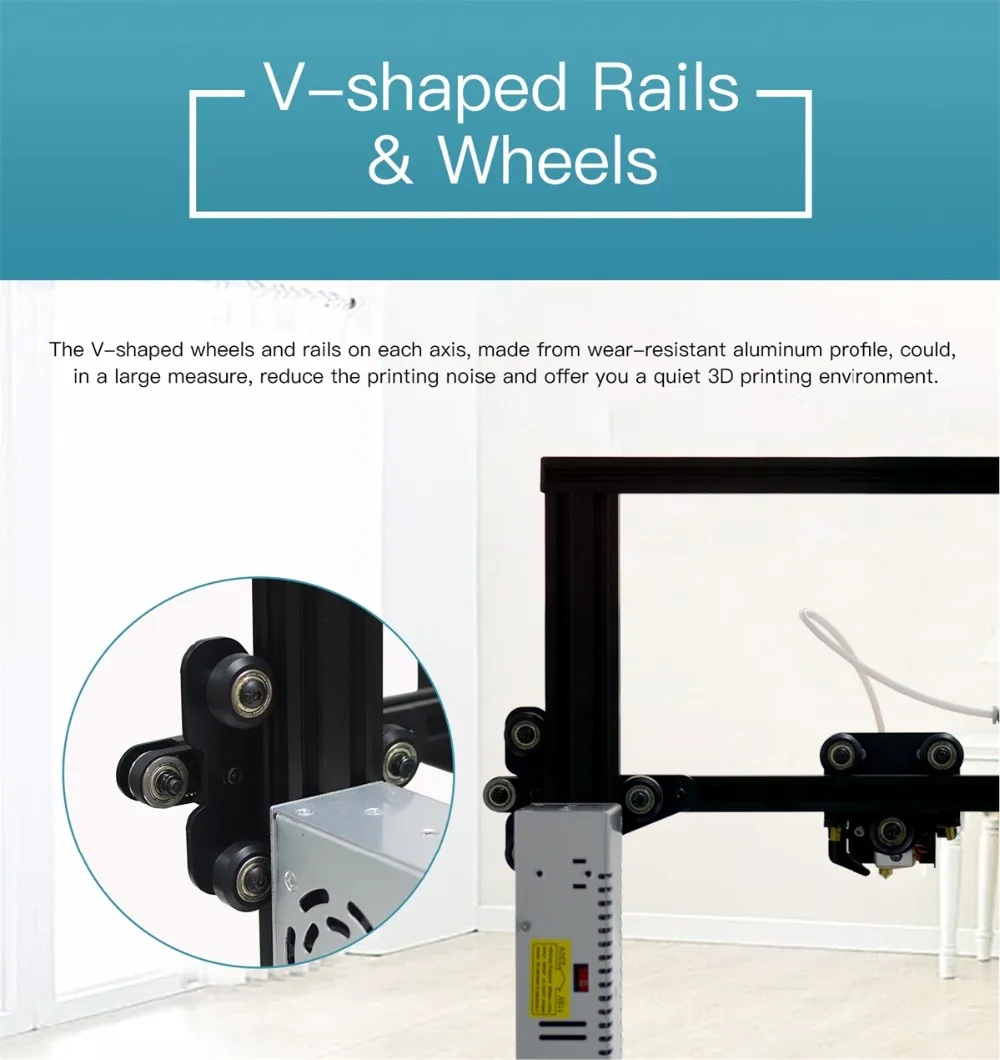 4. The V-shaped wheels and rails on each axis, made from wear-resistant aluminum profile, could, in a large measure, reduce the printing noise.