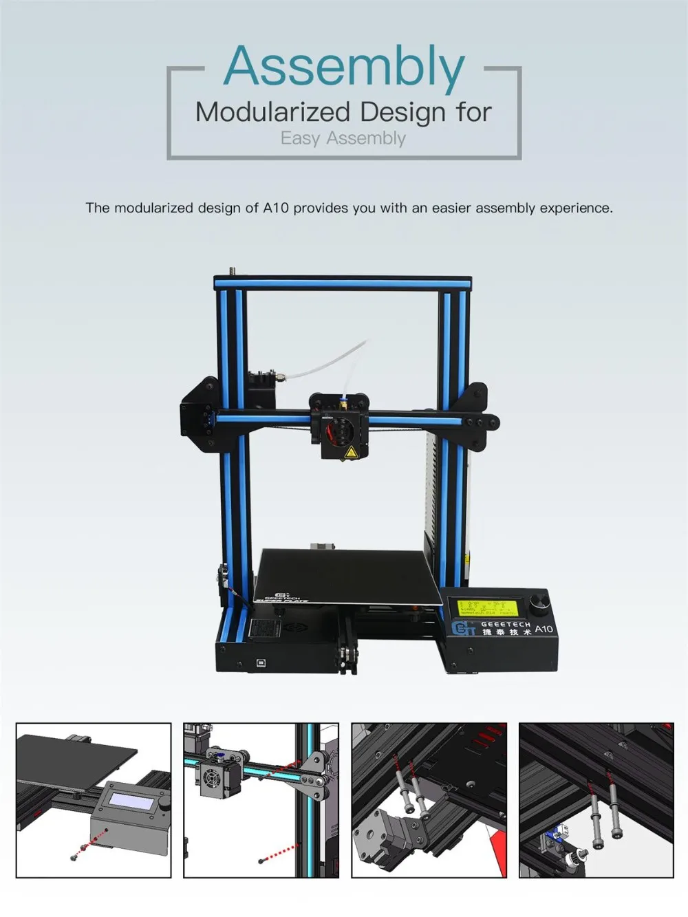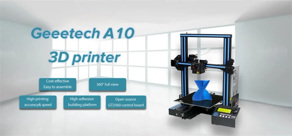 Geeetech A10 3D printer, using open source GT2560 control board, is reliable, cost-effective and easy-to-assemble. Running stably, it aims to provide users with quality printout and satisfactory printing experience.