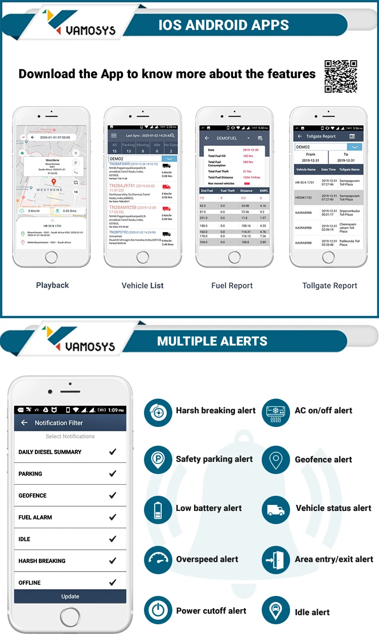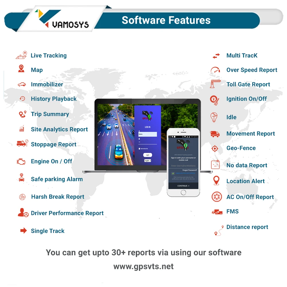 Vamosys GPS Vehicle Tracking System includes advanced features like live location and real time tracking, speed monitoring, idle time report, alert notifications, geofencing and landmarks, history replay, activity reports, vehicle engine control and much more!