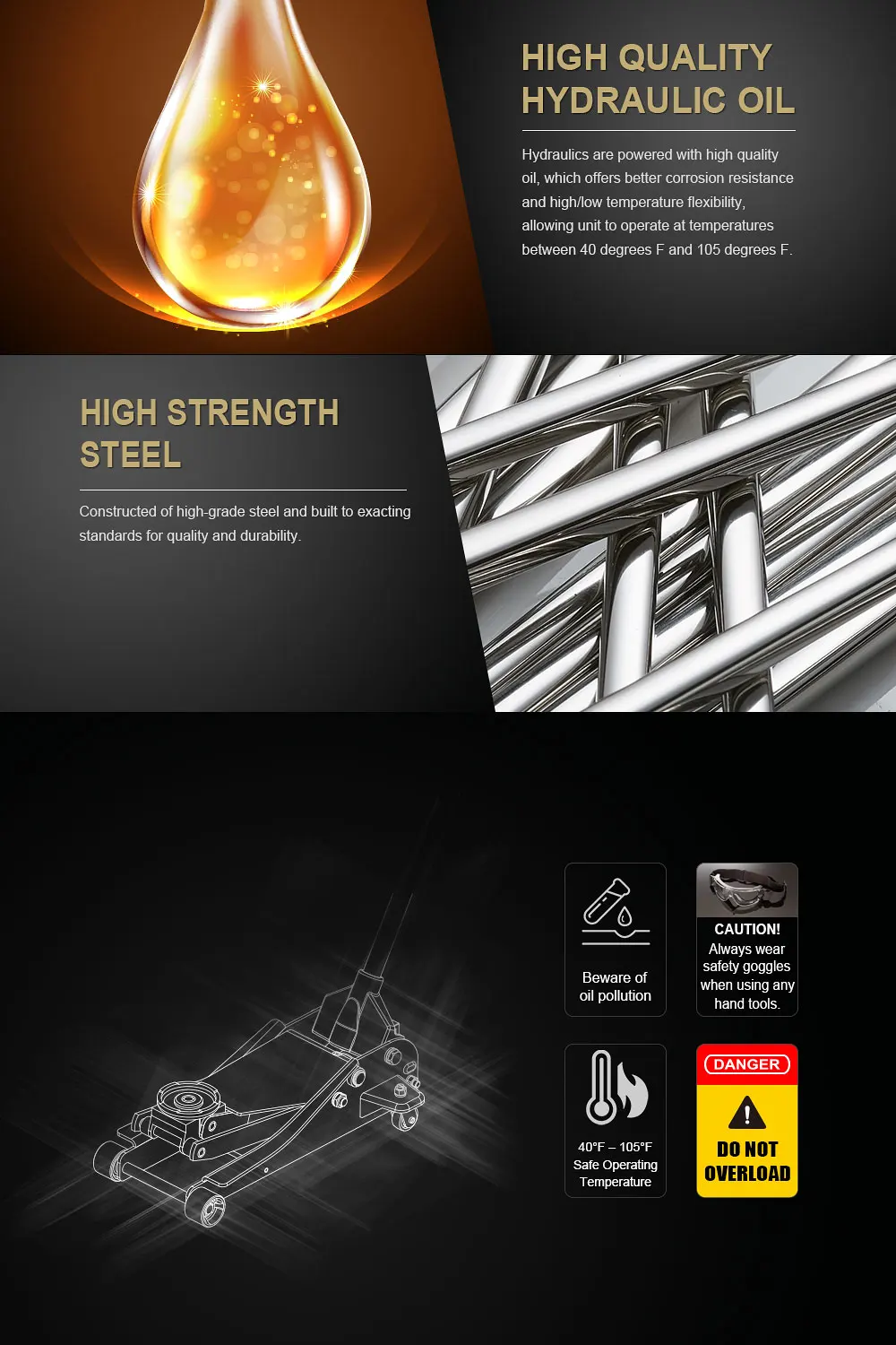 shields and wiper seals protect the hydraulic system from contaminants. The jack features an overload valve