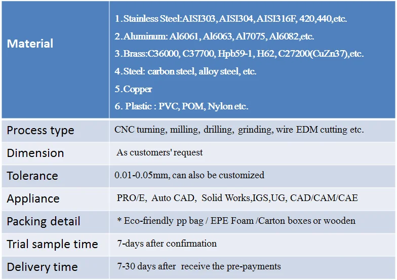 | Packaging Detail: | *various metal Precision Cnc Machining Parts in Eco-friendly pp bag / EPE Foam /Carton boxes or wooden boxes * As customer's specific requirements; | tolerance: | 0.01-0.05mm can also be customized; |