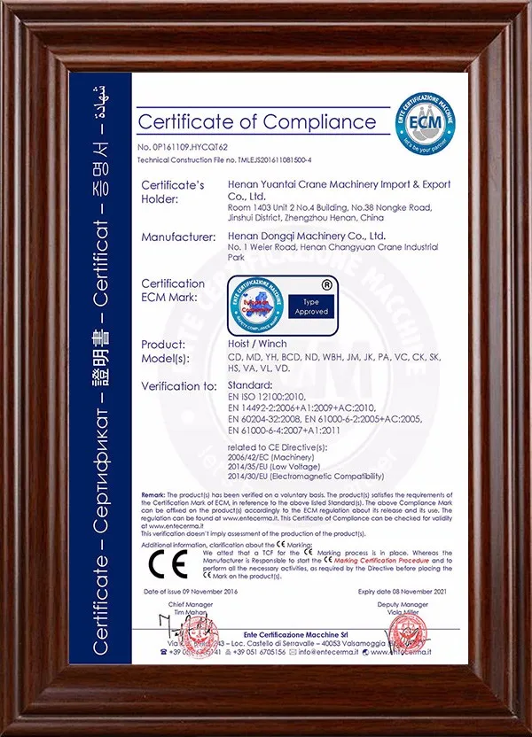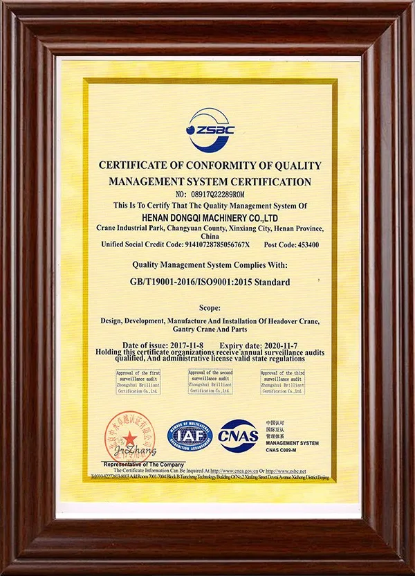 Sticking on national standards, Yuantai has passed ISO9001 international quality system certification, ISO14004 environment management system certification, OHSA18001 which comprehensively promotes overall management level and makes DQCRANES known and welcomed by international customers.