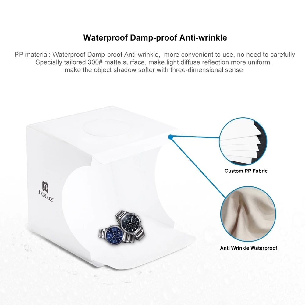| Backdrops Material: | EVA, non-woven; | Packaging Detail: | 1 x Main Studio Box(with 2 LED panels 1 x Round PVC Plate 1 x Soft Bag 6 x EVA Backdrops(6 different colors) 1 x 1-to-2 USB Splitter Cable(USB2.0 to Micro USB) 1 x User Manual; |