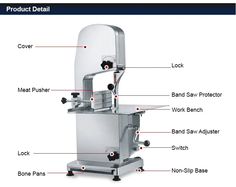Ideal for cutting fresh meat or frozen meat,bones,fish etc in buther shops,clubs,hotels and restaurants.With safty lock,when the machine outer covering open,will automatically switch off.