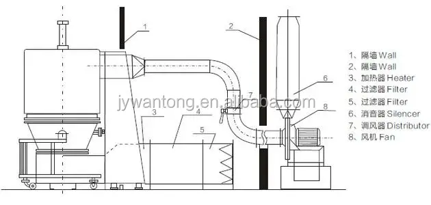 Put the material (granule or powder) into the charging hopper. Meanwhile filter the dust in the air by the filter and heat the material to the demanded temperature by the heater. When the air gets through the Dutch sieve, the material is fluidized and dried. The steam is drawn by the fan through the dedust bags. The superfine powder will be collected by the filter bags and can be shaken back to the container after fluidizing by the upper shaking cylinder.