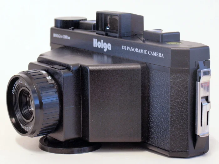 The Holga 120 Pan is a medium format film Panoramic Camera that takes 180º panoramic images on 120 format color or B&W film. The camera came fitted with a 90mm fixed focal length lens with a choice of two aperture settings - sunny and cloudy - and a single shutter speed of 1/100 second. Focusing is adjustable to 4 zones - portrait, small group, big group, and infinity.