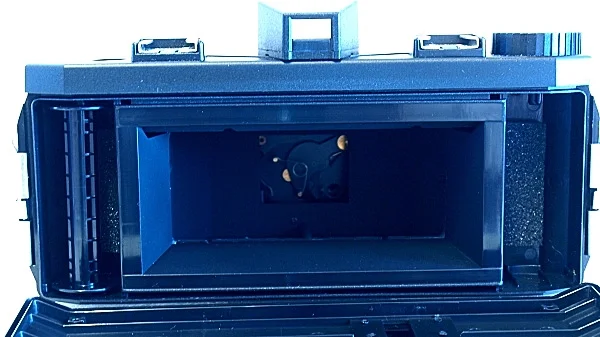 The camera needs no batteries to operate, all you have to do is simply insert the film, wind it forward to the correct next-one-up frame number, and shoot. You will end up with six 60x120mm exposures per 120 roll.