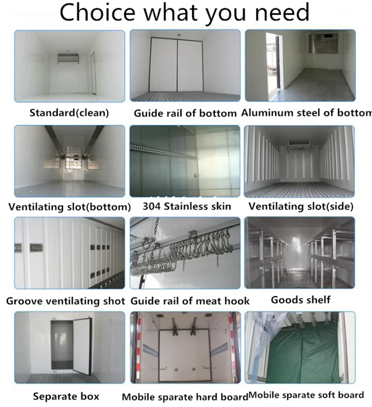 For the special requirements of freezer vehicle,such as the meat transportation, the meat hook, aluminum alloy guide rail and ventilation slots, ladder, LED lamp, etc. parts can be chosen and installed. Different refrigerated units are available like Carrier, Thermos King, Dongin, Kingtec, etc. The standby battery, side door, side windows, etc are optional.